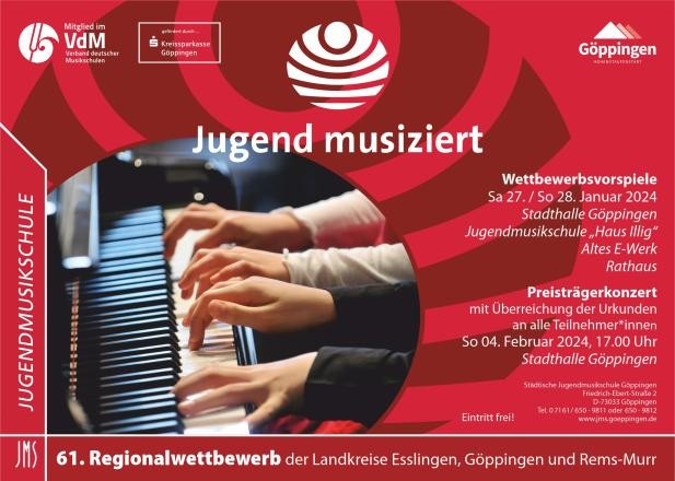 Erfolgreich verlief der 61. Regionalwettbewerb am 27. und 28. Januar 2024, der - organisiert von der Städtischen Jugendmusikschule Göppingen - mit rund 340 teilnehmenden Kindern und Jugendlichen aus den Landkreisen Esslingen, Göppingen und Rems-Murr zum 11. Mal in der Hohenstaufenstadt stattfand. Viele Musikfreunde aus der Region besuchten an den beiden Wettbewerbstagen die öffentlichen Vorspiele. Das hohe musikalische Niveau der jungen Teilnehmerinnen und Teilnehmer, die idealen Wettbewerbs-Spielorte Jugendmusikschule, Altes E-Werk, Stadthalle und Rathaus, aber auch die schöne Atmosphäre des Wettbewerbes fanden großen Anklang. Beim Regionalwettbewerb Jugend musiziert gab es hervorragende Ergebnisse für den musikalischen Nachwuchs. Zahlreiche Schülerinnen und Schüler wurden zum Landeswettbewerb, der vom 13. bis 17. März 2024 in Offenburg stattfindet, weitergeleitet. Die vollständige Ergebnisliste des Regionalwettbewerbs ist auf der Homepage des Wettbewerbs Jugend musiziert einzusehen. Hier gibt es aktuelle Informationen zum Wettbewerb .