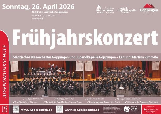 Mit ihrem traditionellen Frühjahrskonzert sind am Sonntag, 26. April 2026, 18.00 Uhr, die Jugendkapelle und das Städtische Blasorchester Göppingen unter der Leitung von Martina Rimmele in der Stadthalle zu erleben. Hier gibt es das Konzertprogramm (PDF, 1,4 MB). Hier geht es zur PM (PDF, 373 KB).