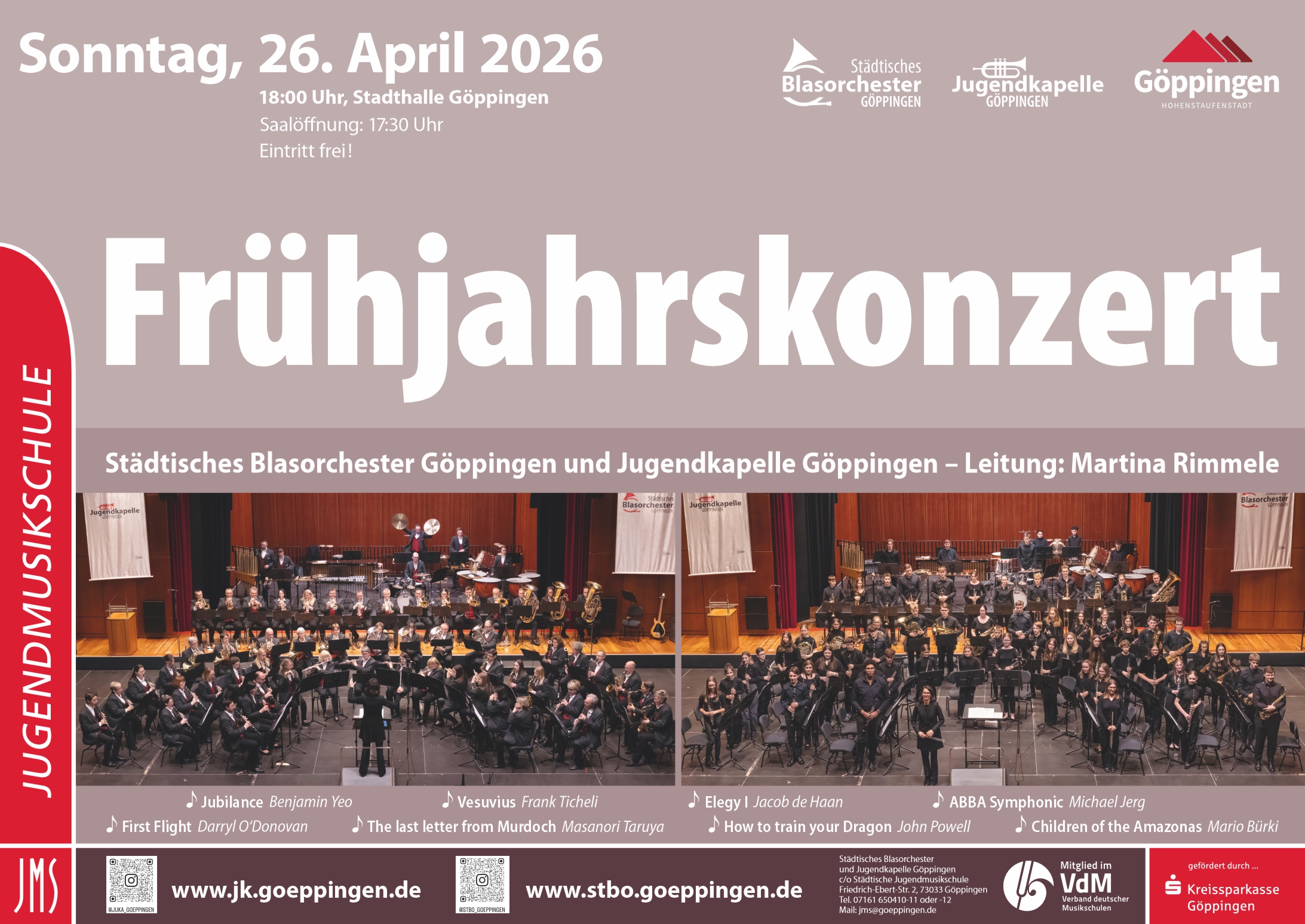 Mit ihrem traditionellen Frühjahrskonzert sind am Sonntag, 26. April 2026, 18.00 Uhr, die Jugendkapelle und das Städtische Blasorchester Göppingen unter der Leitung von Martina Rimmele in der Stadthalle zu erleben. Hier gibt es das Konzertprogramm (PDF, 1,4 MB). Hier geht es (demnächst) zur PM.