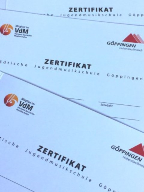 Als staatlich anerkannte Bildungseinrichtung stellt die Städtische Jugendmusikschule Göppingen Jahreszertifikate aus. Zum Abschluss des Schuljahres erhalten alle Schülerinnen und Schüler der Jugendmusikschule das Jahreszertifikat über die allgemein bildenden Schulen zusammen mit den Sommerzeugnissen. Mit dem Musikschul-Zertifikat wird das besondere Engagement der Schülerinnen und Schüler gewürdigt. Auch die Bildungspartnerschaft mit den allgemein bildenden Schulen wird betont. Das Zertifikat dokumentiert die erfolgreiche Teilnahme am Instrumental- und Vokalunterricht, an Gehörbildung und Musiktheorie, an der Ensemblearbeit, an besonderen Projekten und Arbeitsgemeinschaften sowie am Wettbewerb "Jugend musiziert". Jahreszertifikate (PDF, 62 KB)