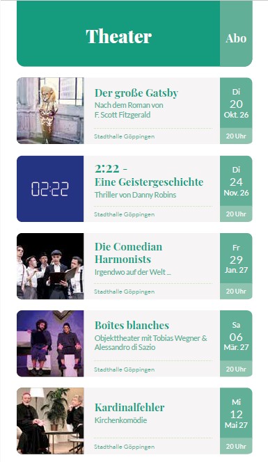 Genießen Sie die Göppinger SpielZeit mit den attraktiven Angeboten im Bereich der Theater- bzw. Konzertmiete. Das Theaterabonnement beinhaltet 5 Theaterstücke und das Konzertabonnement 3 Orchesterkonzerte. Sie buchen Ihre gewünschten Plätze nach Verfügbarkeit und haben dann bei allen Aufführungen den gleichen Platz.