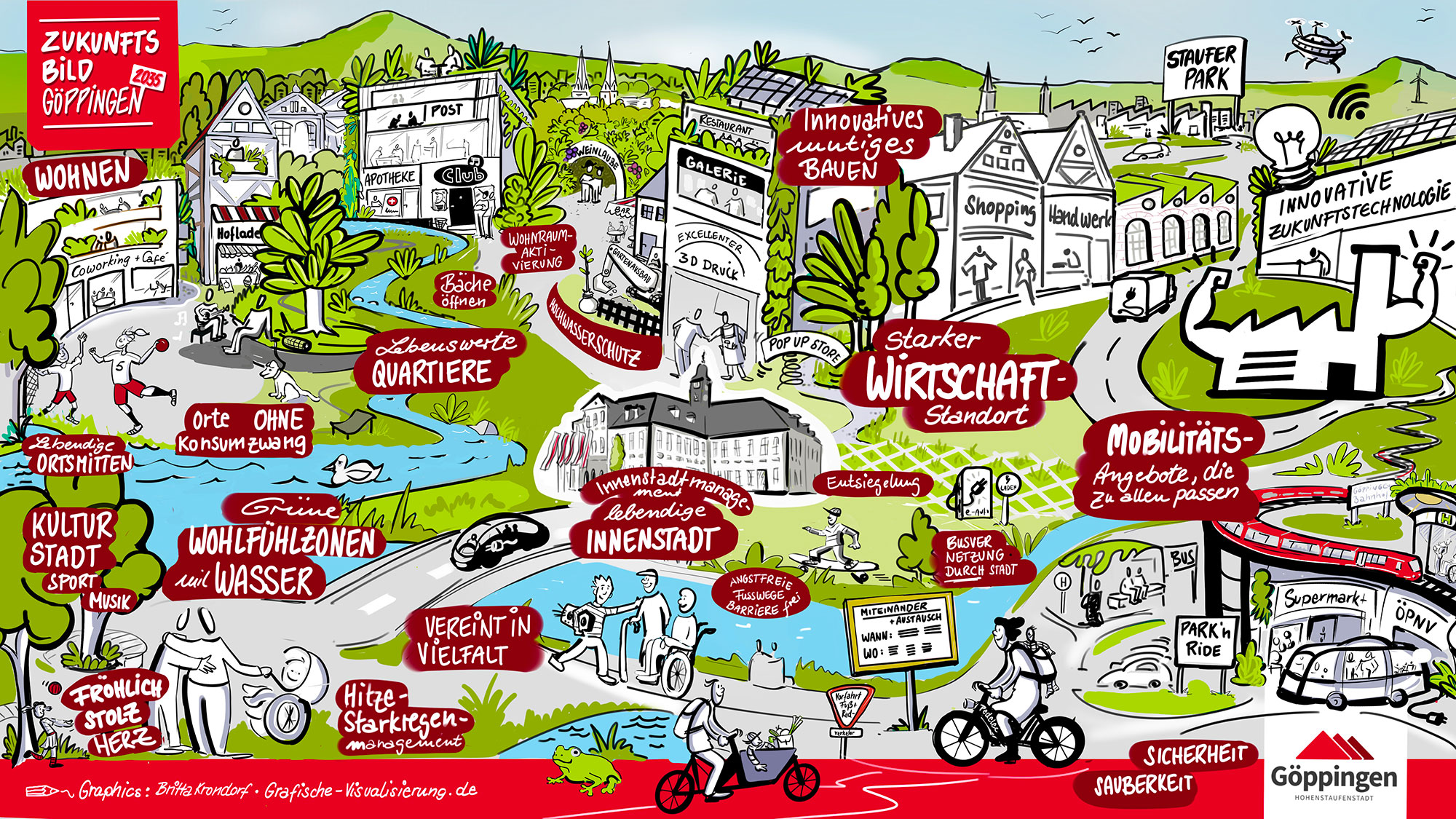 In der Gemeinderatsklausur wurde den StadträtInnen die umfassenden Analyseergebnisse vorgestellt. Im Anschluss wurden in Arbeitsgruppen Zielbilder für Göppingen 2035 entwickelt und in der zweiten Tageshälfte konkrete Ziele für die Stadt benannt. Begleitet wurde der Tag von einer Grafikerin, die live, das sich im Laufe des Tages herauskristallisierende Zukunftsbild für die Stadt Göppingen zeichnete.