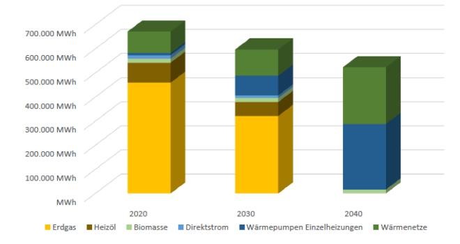 Auf Grundlage der Bestands- und Potenzialanalyse wurde ein Szenario zur Deckung des zukünftigen Wärmebedarfs mit erneuerbaren Energien entworfen, um das Ziel einer klimaneutralen Wärmeversorgung bis zum Jahr 2040 zu erreichen. Hierbei handelt es sich um strategische Überlegungen.