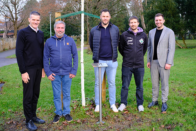 „Wir wollten eine nachhaltige, grüne Erinnerung in der Stadt an die WM schaffen. Schnittblumen verwelken – ein Baum steht tief verwurzelt als Zeichen für die erste Weltmeisterschaft der Geschichte Göppingens“, sagt Erster Bürgermeister Johannes Heberle. Zur Enthüllung gekommen waren auch die beiden Radball Weltmeister Bernd Mlady und Raphael Kopp: „Der WM-Baum ist eine große Ehre für uns. So etwas gab es noch nie“, sagt Bernd Mlady. „Es freut uns sehr, dass die WM einen so positiven, bleibenden Eindruck in Göppingen hinterlässt“, betont Raphael Kopp. Auf dem Schild notiert sind alle Sieger der Hallenrad-WM: