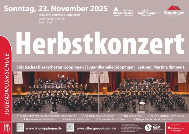 Am Sonntag, 24. November 2019, findet das traditionelle Herbstkonzert der Jugendkapelle und des Städtischen Blasorchesters in der Stadthalle Göppingen statt. Die Leitung hat Martina Rimmele. Beginn ist um 18.00 Uhr. Einlass ist ab 17.30 Uhr, der Eintritt ist frei.