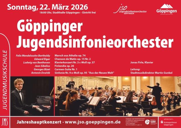 Am Sonntag, 22. März 2026, 18.00 Uhr, gibt das Göppinger Jugendsinfonieorchester unter der Leitung von Stadtmusikdirektor Martin Gunkel sein traditionelles Jahreshauptkonzert in der Stadthalle Göppingen. Auf dem Programm stehen u.a. die Carmen-Suite von Georges Bizet, das Orchesterstück „Chanson de Matin“ von Edward Elgar, die Tondichtung „Finlandia“ von Jean Sibelius und der Finalsatz der 9. Sinfonie „Aus der Neuen Welt“ von Antonin Dvorak. Solist beim Klavierkonzert Nr. 3 c-Moll op. 37 von Ludwig van Beethoven ist der junge Pianist Jonas Firle, mehrfacher Preisträger des Wettbewerbs „Jugend musiziert“. Hier gibt es den Programm-Flyer (PDF, 779 KB). Hier geht es zur PM (PDF, 385 KB).