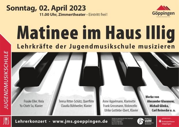 Am Sonntag, 02. April 2023, 11.00 Uhr, veranstaltet die Städtische Jugendmusikschule Göppingen ein Matineekonzert im Zimmertheater „Haus Illig“. Auf dem Programm stehen Solo- und Kammermusikwerke u.a. von Alexander Glasunow, Carl Reinecke und Michael Glinka. Es musizieren Lehrkräfte der Jugendmusikschule: Frauke Eller (Viola), Yu-Chieh Su (Klavier), Teresa Ritter-Schütz (Querflöte), Claudia Bühlweiler (Klavier), Anne Appelmann (Klarinette), Frank Grossmann (Violoncello) und Ulrike Gottlebe-Ebert (Klavier). Der Eintritt ist frei. Hier geht es zum Programm (PDF, 125 KB).