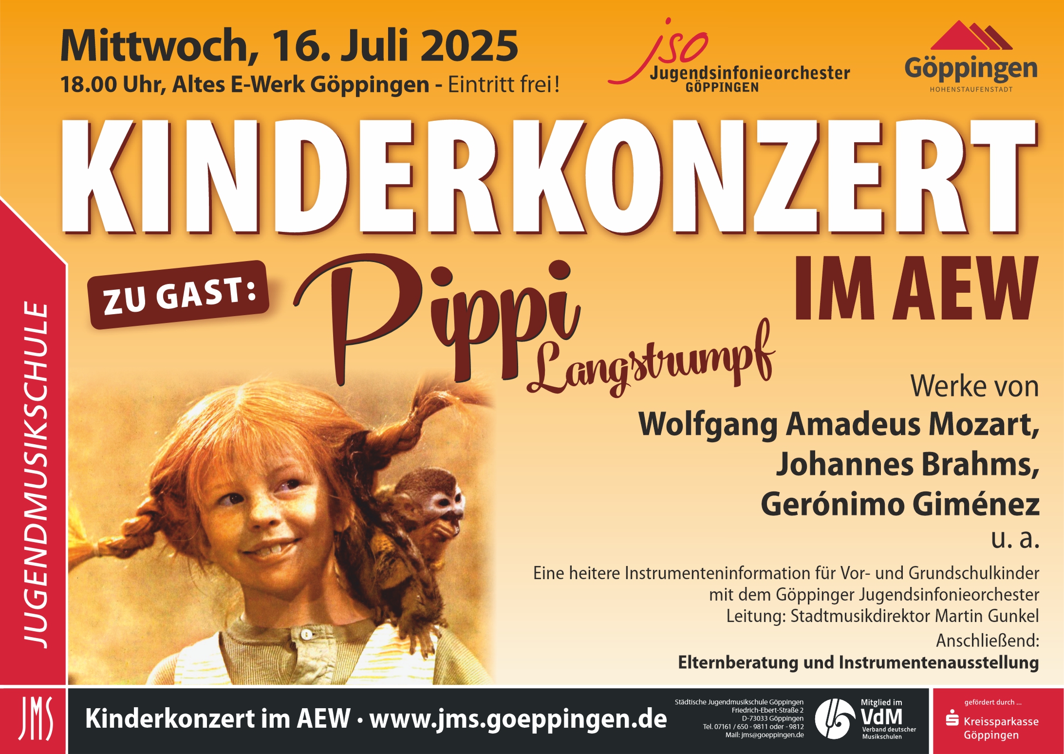 Die Städtische Jugendmusikschule Göppingen veranstaltet am Mittwoch, 16. Juli 2025, 18.00 Uhr, ihr traditionelles Kinderkonzert mit anschließender Elternberatung und Instrumenteninformation im Alten E-Werk Göppingen, Mörikestraße 18. Eingeladen sind alle interessierten Vor- und Grundschulkinder im Alter ab etwa fünf Jahren gemeinsam mit ihren Eltern. Es musiziert das Göppinger Jugendsinfonieorchester. Als besonderer Gast wird Pippi Langstrumpf erwartet. Weitere Info: Online-Magazin prisma / Kreissparkasse (PDF, 1,1 MB) PM (PDF, 107 KB) Göppinger Jugendsinfonieorchester Fotogalerie Kinderkonzert