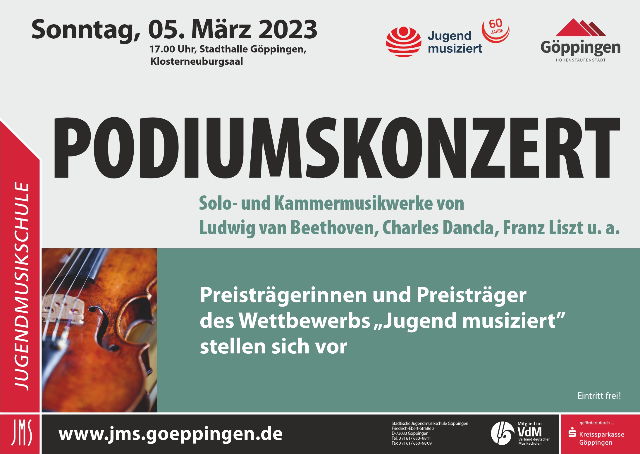 Beim Podiumskonzert am Sonntag, 05. März 2023, 17.00 Uhr, im Klosterneuburgsaal der Stadthalle Göppingen, musizieren erste Preisträgerinnen und Preisträger der Jugendmusikschule, die beim Regionalwettbewerb „Jugend musiziert“ die Weiterleitung zum Landeswettbewerb erhalten haben. Auf dem Programm stehen Solo- und Kammermusikwerke u.a. von Ludwig van Beethoven, Charles Dancla, Franz Liszt und Bela Bartok. Der Wettbewerb „Jugend musiziert“ ist in Deutschland eine der bedeutendsten und erfolgreichsten Veranstaltungen für junge Musikerinnen und Musiker. Getragen vom Deutschen Musikrat finden musikbegeisterte Kinder und Jugendliche ein Forum für sich und ihre Kunst. Hier geht es zur PM (PDF, 223 KB) und zum Programm (PDF, 279 KB).