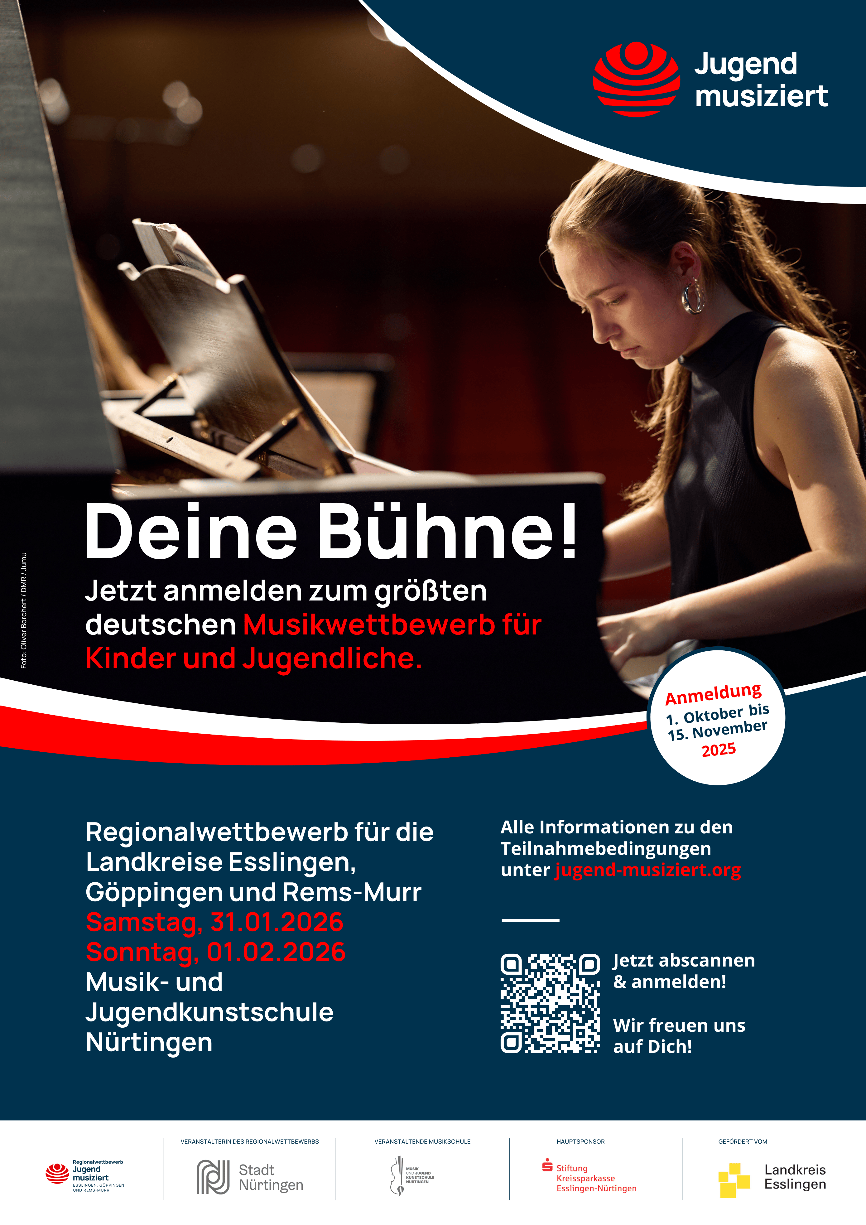 Der 63. Regionalwettbewerb "Jugend musiziert" der Landkreise Esslingen, Göppingen und Rems-Murr findet am 31. Januar und 01. Februar 2026 in Nürtingen statt. Die Wettbewerbsvorspiele sind öffentlich. Das Preisträgerkonzert mit Überreichung der Urkunden an alle Teilnehmenden ist für Sonntag, 08. Februar 2026, in der Stadthalle Nürtingen geplant. Informationen zur Ausschreibung und zum Online-Anmeldeverfahren sind über die Jumu-Homepage des Deutschen Musikrates einzusehen. Die Anmeldefrist läuft bis 15. November 2025 .Wir freuen uns auf viele teilnehmende Kinder und Jugendliche. Hier gibt es weitere Informationen (PDF, 4 MB).