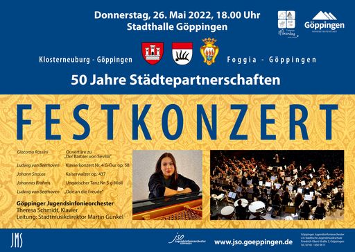 Nach rund zweieinhalb Jahren coronabedingter Konzertpause war das Göppinger Jugendsinfonieorchester an „Christi Himmelfahrt", 26. Mai 2022, mit dem Festkonzert „50 Jahre Städtepartnerschaften Klosterneuburg - Göppingen - Foggia“ in der Stadthalle Göppingen zu erleben. Hier geht es zur Konzertkritik der NWZ Göppingen (PDF, 581 KB) vom 28.05.22. Auf dem Programm standen u.a. die Ouvertüre zur Oper „Der Barbier von Sevilla“ von Giacomo Rossini, der Kaiserwalzer op. 437 von Johann Strauss und der Ungarische Tanz g-Moll von Johannes Brahms. Solistin beim Klavierkonzert G-Dur op. 58 von Ludwig van Beethoven war die sechzehnjährige Pianistin Theresa Schmidt, mehrfache Preisträgerin des Wettbewerbs „Jugend musiziert“ aus der Klavierklasse von Ulrike Gottlebe-Ebert an der Städtischen Jugendmusikschule Göppingen.