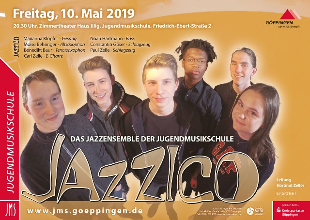 Das Jazzensemble der Städtischen Jugendmusikschule Göppingen gibt am Freitag, 10. Mai 2019, um 20.30 Uhr, sein Jahreskonzert im Zimmertheater Haus Illig. JAZZICO ist einer der zentralen Punkte der popularmusikalischen Ausbildung der Jugendmusikschule. Verschiedene Vorstufen sind dem Ensemble zugeordnet. Die Schülerinnen und Schüler finden hier ein Podium für Jazzmusik und für die Kunst der Improvisation. mehr (PDF, 264 KB)